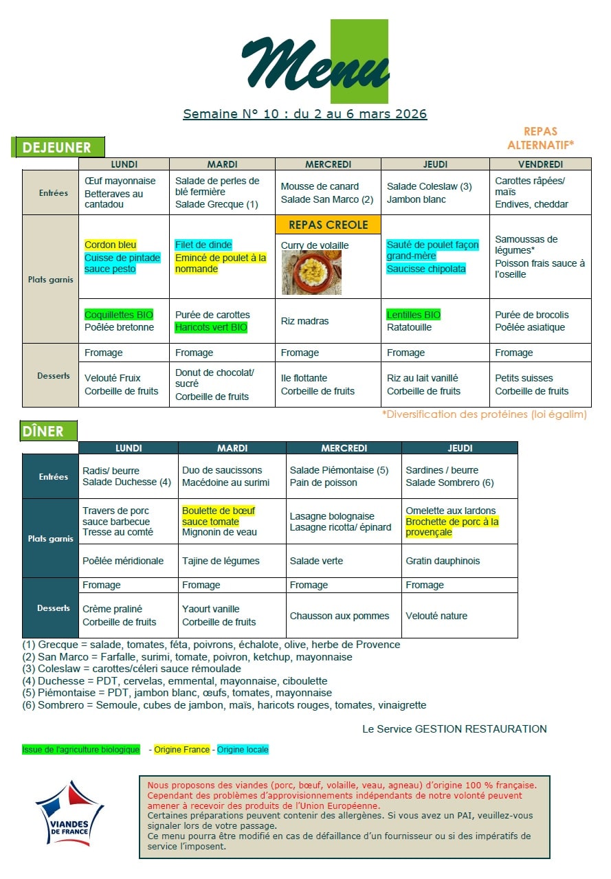 Découvrez notre menu de la semaine : du lundi 02 au vendredi 06 mars 2026.