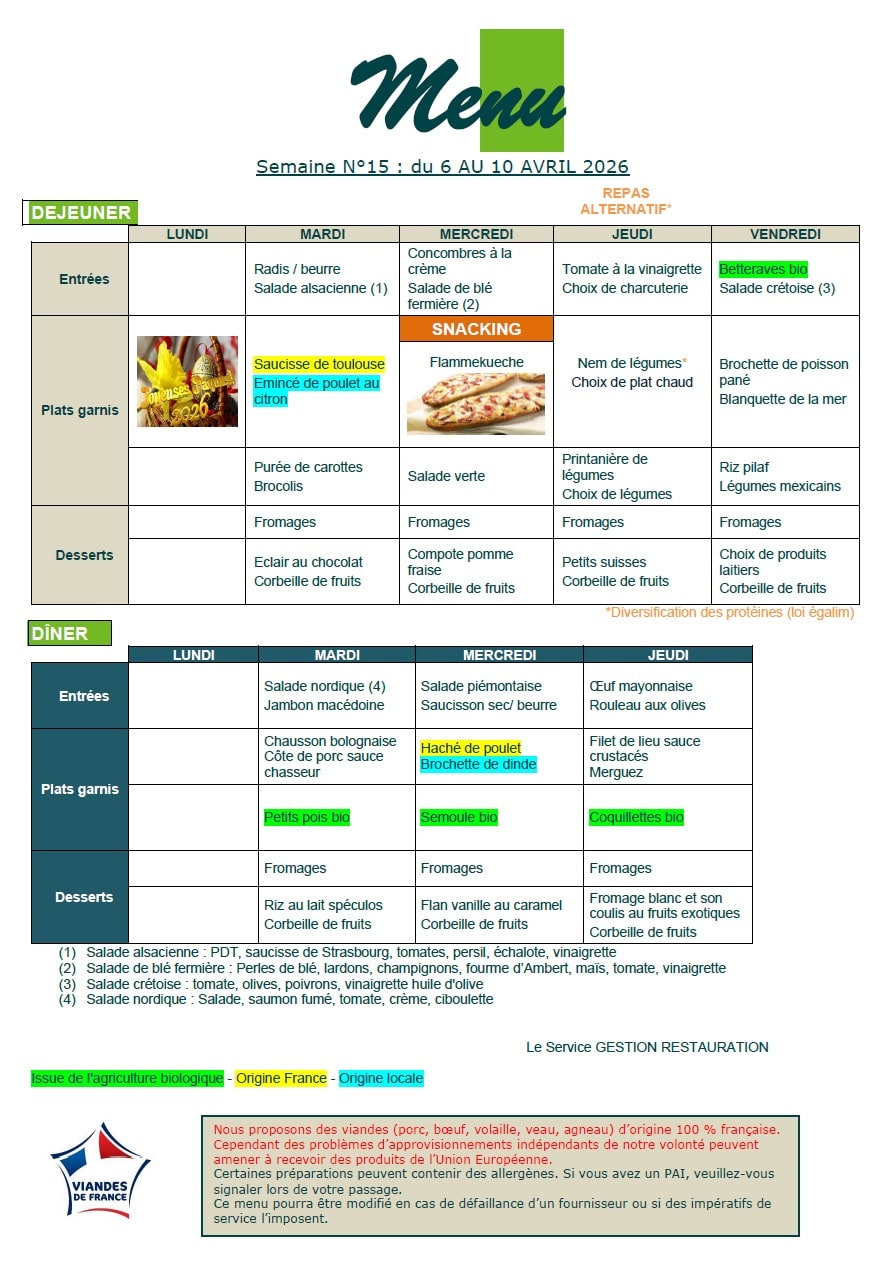 Découvrez notre menu de la semaine : du mardi 07 avril au vendredi 10 avril 2026.