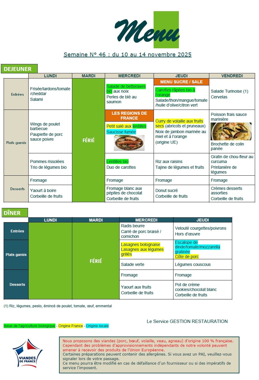 Découvrez notre menu de la semaine : du lundi 10 au vendredi 14 novembre 2025.